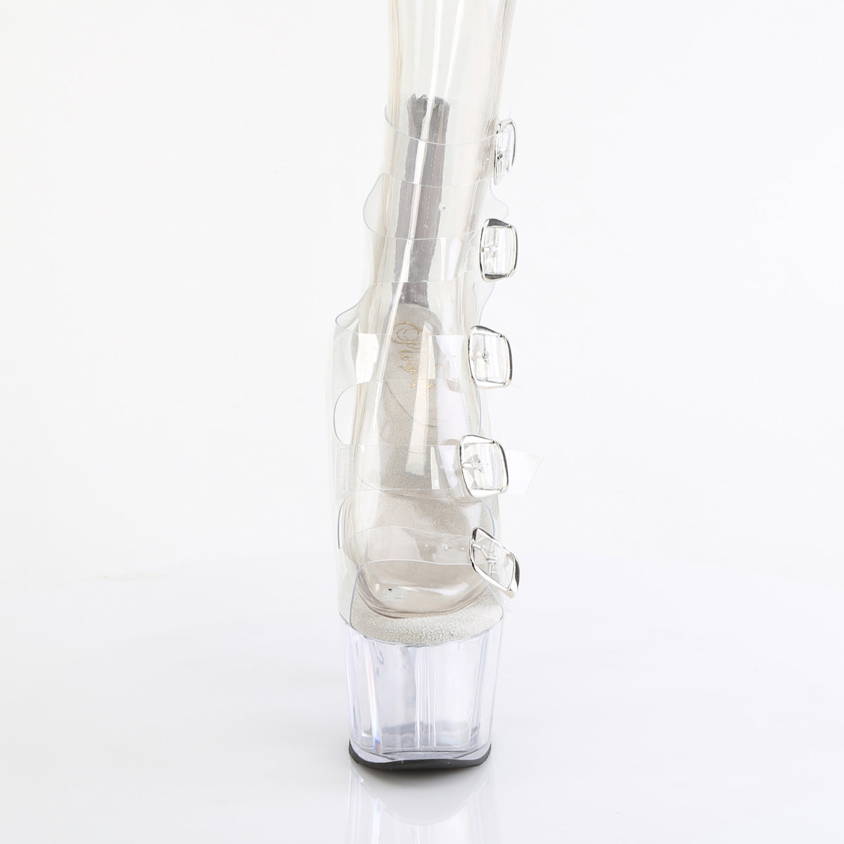 7"" (178mm) Heel, 2 3/4"" (70mm) Platform Open Toe Translucent Bootie Sandal With Five Buckled Straps Detail