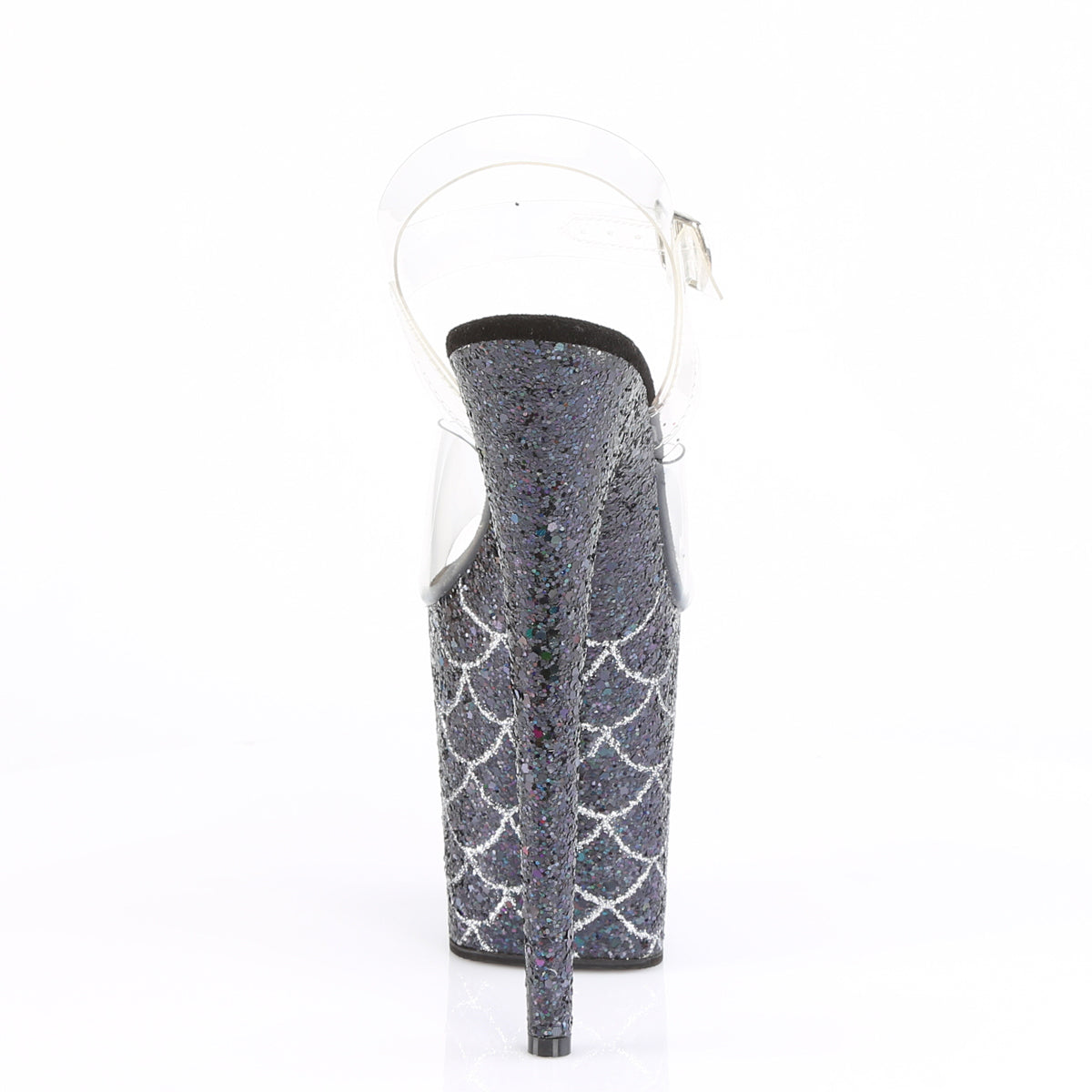 | Additional Description | 8 "" (203 mm) talón, 4 "" "(102 mm) Sandalia de correa de tobillo con brillo holográfico Mermaid Diseño de escamas en las plataformas |