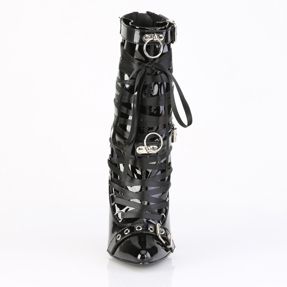 Additional Description 6 1/4"" (159mm) Solid Brass Heel Ankle Boot Featuring Lace Detail & Buckle Straps w/ O-Rings, Full Back Metal Zip Closure
